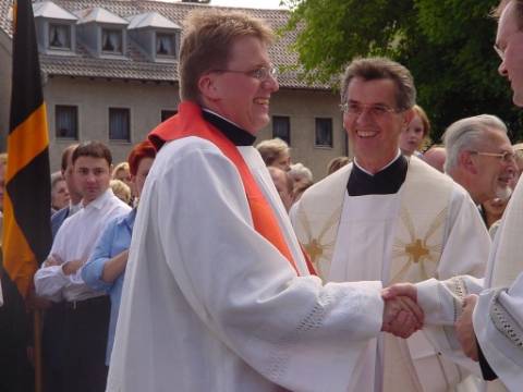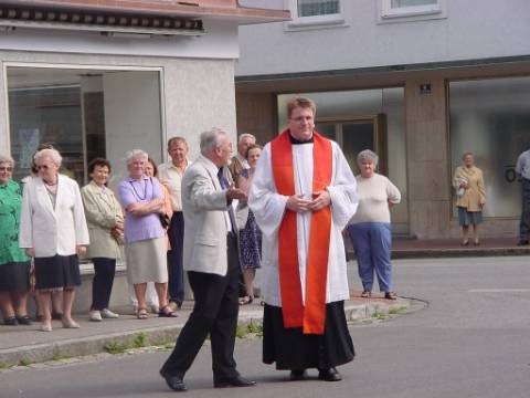 | Kirchenpfelger Werner Kohl begrüßt den Primizianten |  |